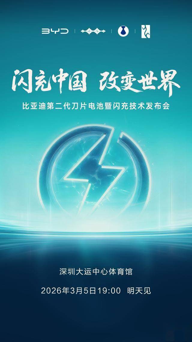 IT之家 3 月 4 日消息,比亚迪汽车今日官宣,比亚迪第二代刀片电池暨闪充技术发布会定档 3 月 5 日 19:00 在深圳大运中心体育馆举行。