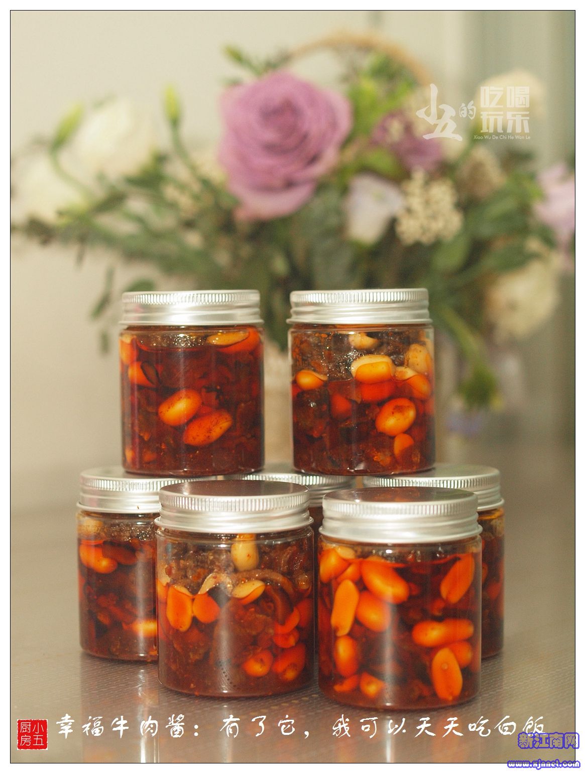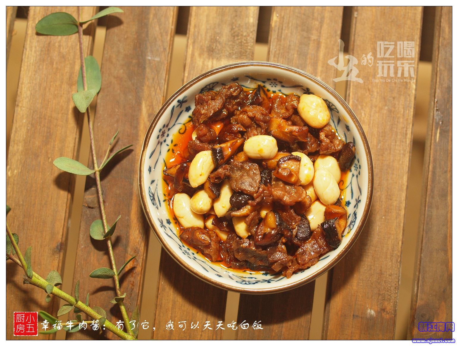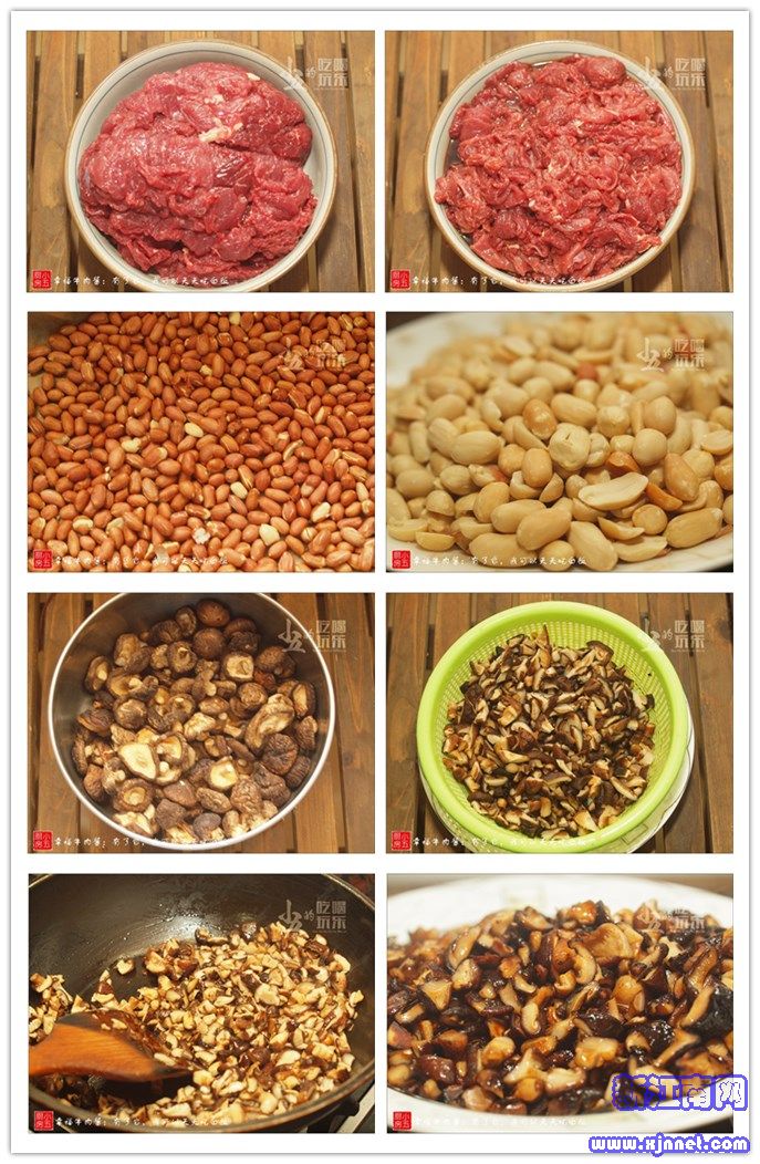 【食材】牛肉500g、花生250、香菇50g、花椒粉5g、辣椒粉20g、生抽30g、食用油350g、盐5g