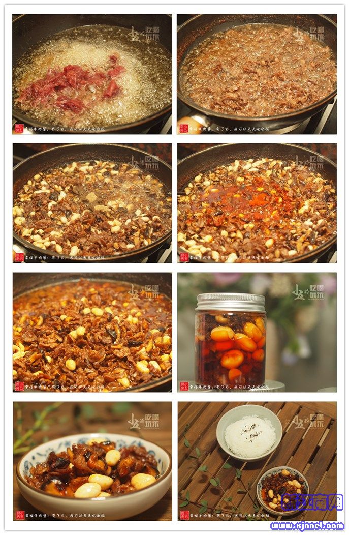 原锅下油,待油温升高,下牛肉;将牛肉炸至深色,吃起来有种炸酥肉的感觉,需要15-20分钟左右;加入花生,香菇与花椒;加入辣椒粉;加入盐,搅拌均匀,即可熄火;待其凉却后,装入瓶中密封保存;食用时用干净无油的筷子或勺子取出食用,在冰箱冷藏保鲜2个星期没有问题。