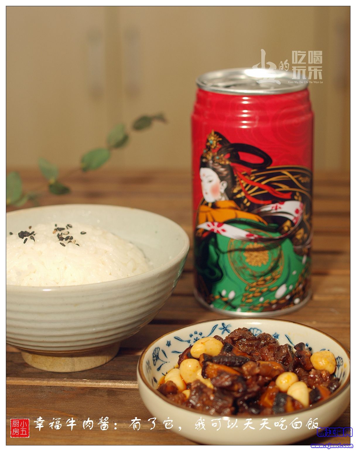 人仰马翻的那一周,幸好我有牛肉酱,瓶子一打开,香气关都关不住,舀一勺放在热气腾腾的米饭上,一碗饭,一勺酱,一杯茶,简单的一餐却吃的心满意足。酱里有看得见的牛肉,香菇与花生,混合了花椒、辣椒的香味,香气浓郁,开胃之极。