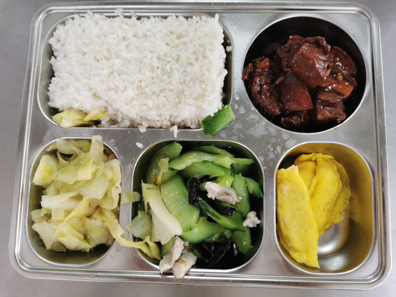<爱上你,爱上新江南网:www.xjnnet.com 欢迎您!>中午开饭时间到了,新北区第二实验小学的四菜一汤,每份8元5角,真是价廉物美食材好的放心午餐哇!tuh新江南网|江南区域知名综合门户网