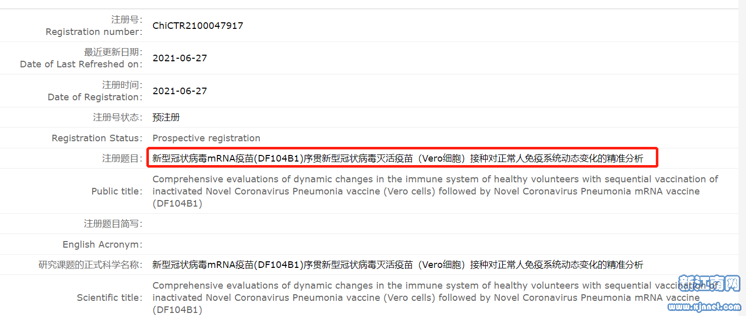 另外,根据在中国临床试验注册中心官网公布的新冠肺炎临床研究索引来看,从2020年1月至8月6日3时2分,共计875个新冠肺炎临床研究,其中6月27日有“新型冠状病毒mRNA疫苗(DF104B1)序贯新型冠状病毒灭活疫苗(Vero细胞)接种对正常人免疫系统动态变化的精准分析”的注册题目。