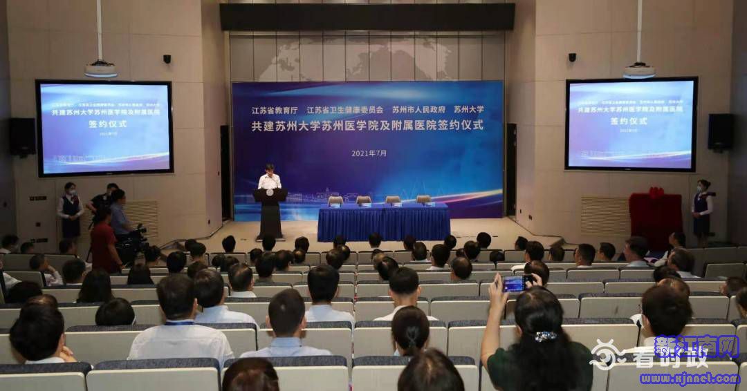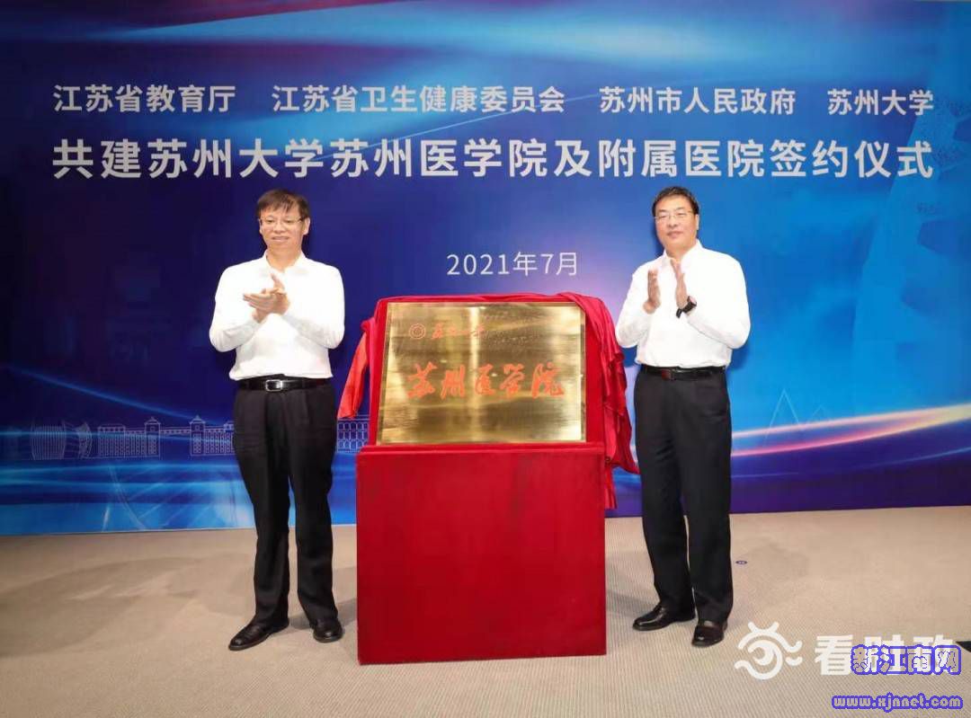 今天(7月7日),省教育厅、省卫健委、苏州市政府、苏州大学签约共建苏州大学苏州医学院及附属医院。省委常委、市委书记许昆林,副省长马欣共同为苏州大学苏州医学院揭牌。中国工程院院士,北京大学党委原常委、原常务副校长、医学部原主任詹启敏,中国科学院院士、中科院生物物理研究所原所长王志新出席仪式。省教育厅厅长葛道凯,省卫健委主任谭颖,市委副书记、市长李亚平在仪式上讲话。苏州大学党委书记江涌出席,校长熊思东致辞。