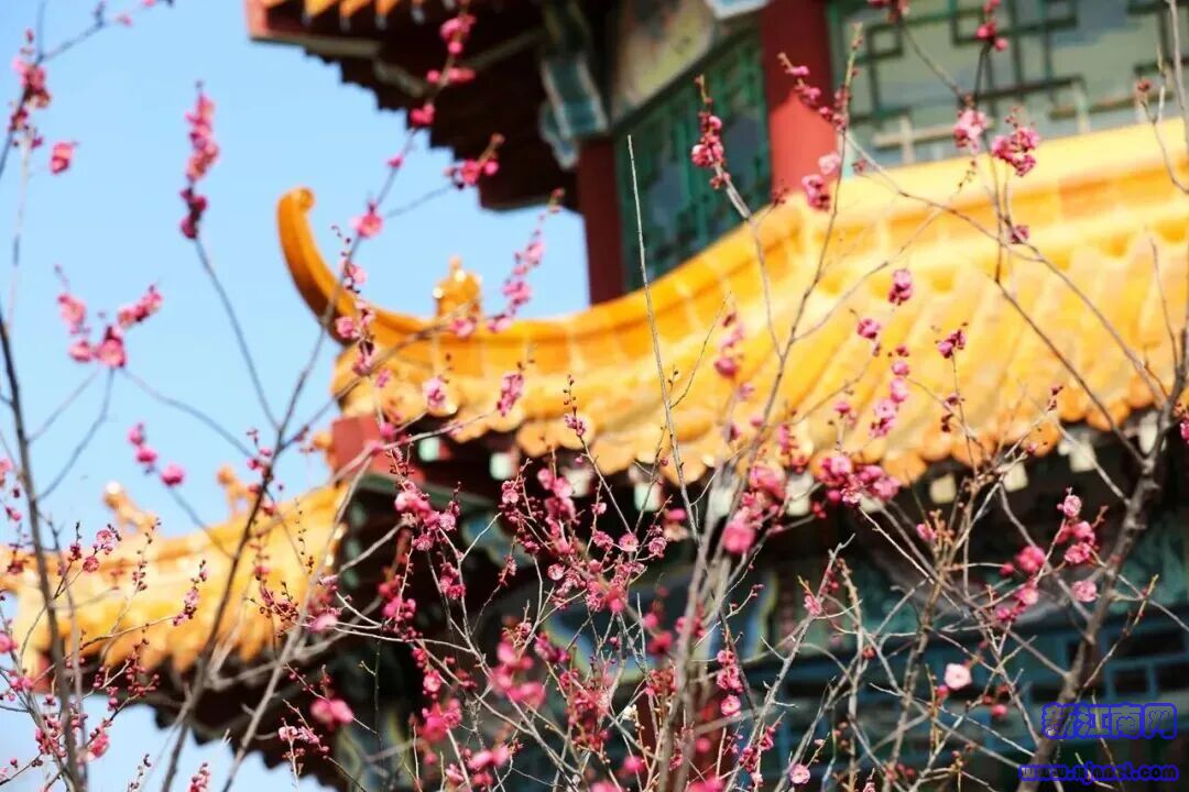 金灿灿的琉璃瓦映衬着红梅,历史感与生机在这里交融。长廊下小坐片刻,花影落在肩头,分外温柔。