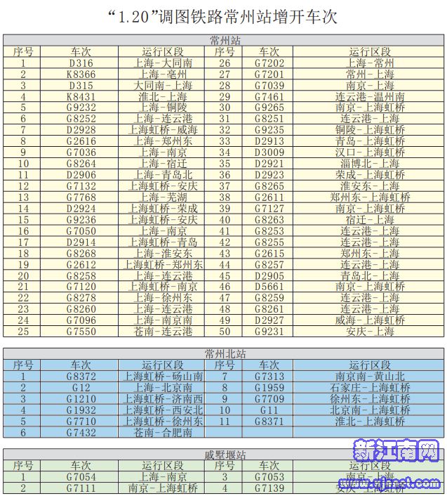 此次“1.20”调图,常州既有站新增旅客列车4列,主要方向为亳州、大同、上海等地;常州城际站新增旅客列车46列,主要方向为连云港、徐州、淮安、河南、山东等地;戚墅堰站新增旅客列车4列,主要方向为南京、上海等地;常州北站新增旅客列车11列,主要方向为北京、山东等地。