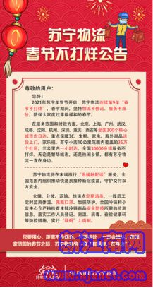 以商品配送为例,春节期间苏宁将提供从前端商品保障、中端物流配送到后端安装系统化服务,上海、南京等全国300个核心城市依旧提供"次日达"服务。同时为保障消费者安全,苏宁易购还特别加码推出“十道防护”服务标准,确保每一件商品在安全底线上高效抵达。