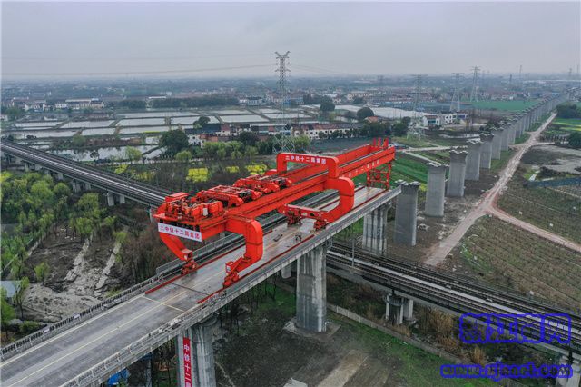 记者了解到,此处架梁是南沿江城际铁路唯一跨越京沪高铁架梁,也是中国铁路上海局范围内首座上跨时速350公里高铁的架梁。