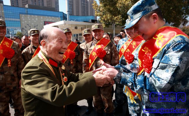 昨天,93岁的抗战老兵夏锡生老人赶到金坛区人武部,为新兵戴上大红花,并勉励新兵苦练本领,守好国防,同时为家乡争光。 王玉华摄