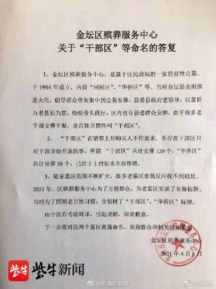 据介绍,该处公墓名叫“金坛区殡葬服务中心”。金坛区殡葬服务中心(区公墓办)是属于区民政局下属的经营性公墓,于1984年成立,内设“回民区”、“华侨区”等墓区。当时金坛县全面推进火化,倡导群众骨灰集中到公墓安葬。县委县政府老领导纷纷带头践行骨灰集中安放,区内也有普通群众安葬,由于很多老干部安葬于此,老百姓口中习惯性叫“干部区”。“干部区”墓地在销售上对购买人不作要求,不存在只对干部身份的人开放。“干部区”共有墓穴120个,“华侨区”共有墓穴58个,已于上世纪末全部售罄。随着公墓向公园化发展,今年区殡葬服务中心对公墓的基础设施进行了改造,墓区结构发生了明显变化,很多老墓区家属反应找不到祖坟。2021年,区殡葬服务中心为了方便群众祭祖,为老墓区安插了名称标牌。当时为了照顾老百姓习惯,分别树了“干部区”“华侨区”标识牌。由于没有考虑周详,引起误解,在此金坛区殡葬服务中心深表歉意。下一步金坛区殡葬服务中心将对这两个墓区重新命名,欢迎广大网友和媒体监督。