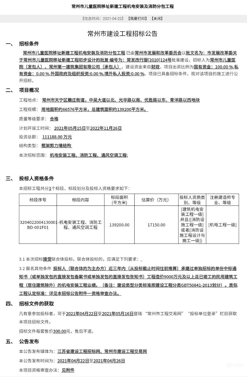在昨天常州市公共资源交易网发布的常州市儿童医院移址新建工程机电安装级消防分包工程招标工程中得知,常州儿童医院新址工程预计会在2022年11月完工,项目总投资11.1亿元。