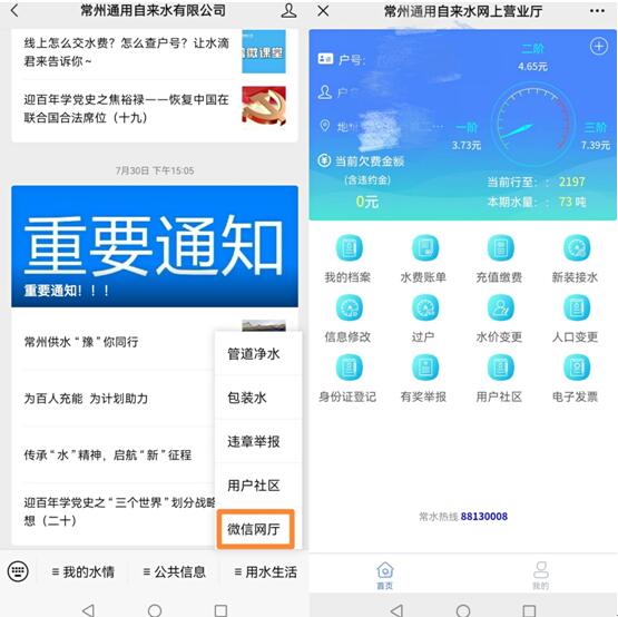 为减少人员接触,通用水司建议您优先选择常州通用自来水有限公司网站和微信公众号的线上功能,或者拨打24小时常水热线88130008进行业务咨询。目前常州通用自来水有限公司网上营业厅涵盖了水费账单、充值缴费、新装接水、信息修改、过户等多项业务办理,广大客户可以人在家中坐,业务指尖办!