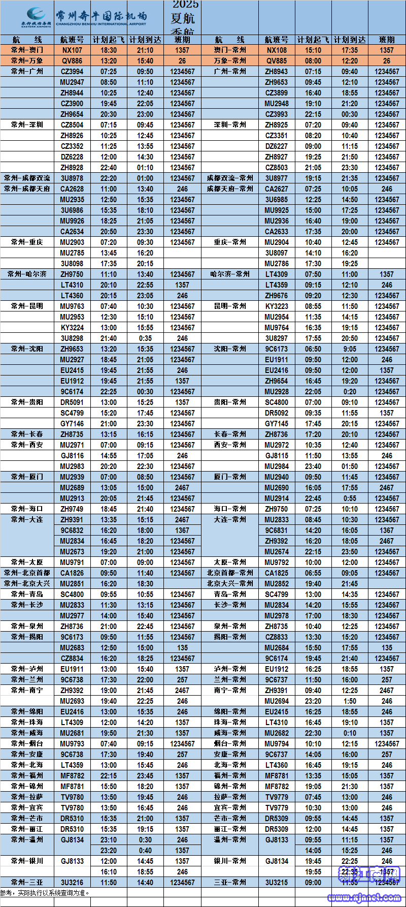 此次换季后,常州机场合作航司增至19家,通航41个机场,每天2班以上通航点14个。新增拉萨、丽江、芒市、烟台、威海、宜宾、泸州航线,加密揭阳潮汕、南宁、厦门、贵阳等航班频次。其中,常州至广州、深圳和成都的航班密度都在每天5班(含)以上。继续通航安康、锦州等特色航点,助力“老少边红”地区经济发展。