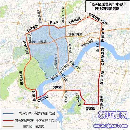 其中,杭州市新增“浙A区域号牌”小客车限行范围和限行时段。限行范围:石祥西路—石祥路—石祥东路—杭浦高速—绕城高速公路(北线)—东湖南路—九堡大桥—通城高架路—通惠北路—通惠中路—通惠南路—晨晖路—风情大道—滨文路—之江大桥—之浦路—紫之隧道—紫金港路—紫金港路隧道构成的围合区域内所有道路,以及绕城高速公路范围内所有高架路、快速路(含匝道以及附属桥梁、隧道)。其中杭浦高速、绕城高速公路不含。限行时段:绕城高速公路范围内所有高架路、快速路(含匝道以及附属桥梁、隧道)的限行时段为工作日的7:00—10:00和15:00—20:00时段;限行范围内其他道路的限行时段为工作日的7:00—9:00和16:30—18:30时段。另外,全号段限行范围为《杭州市人民政府关于调整工作日高峰时段区域“错峰限行”交通管理措施的通告》(杭政函〔2014〕54号)规定的限行范围(含边界道路)和绕城高速公路范围内所有高架路、快速路(含匝道以及附属桥梁、隧道)。对应工作日尾号限行,范围为“全号段限行”以外的其他道路。