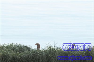 烟雨蒙蒙的西湖边,两只鸳鸯探出头来。 首席记者 陈中秋 摄