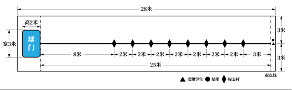 足球项目要求考生须先完成运球绕杆,再完成射门,当球的整体越过球门线时停表,以时间记录成绩。