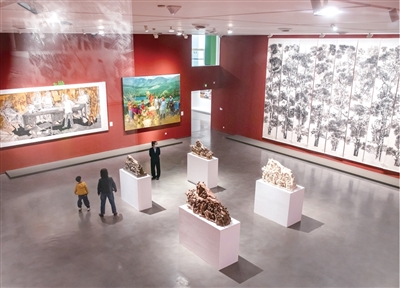 二楼方厅为百年追梦、雕塑东方、经纬四方、视传形象板块,呈现学校在国家历次重大题材创作和重要文化建设任务中主动担当作为的成果,体现了在文明演进与全球对话的宏大框架内“为民族铸魂、为时代造像”的国美贡献。