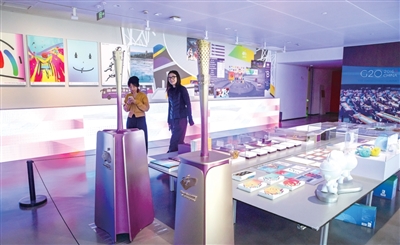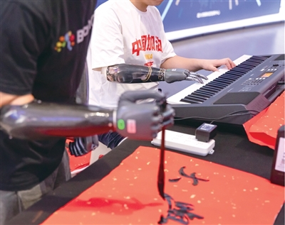 特展开幕现场,两位肢残人士戴上智能仿生手写书法、弹钢琴。