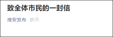 8月11日,江苏淮安官方平台“淮安发布”发布了一条“致全体市民的一封信”。信中透露,按照江苏全省统一部署,8月11日上午起,淮安市开始接收扬州来淮隔离医学观察人员。