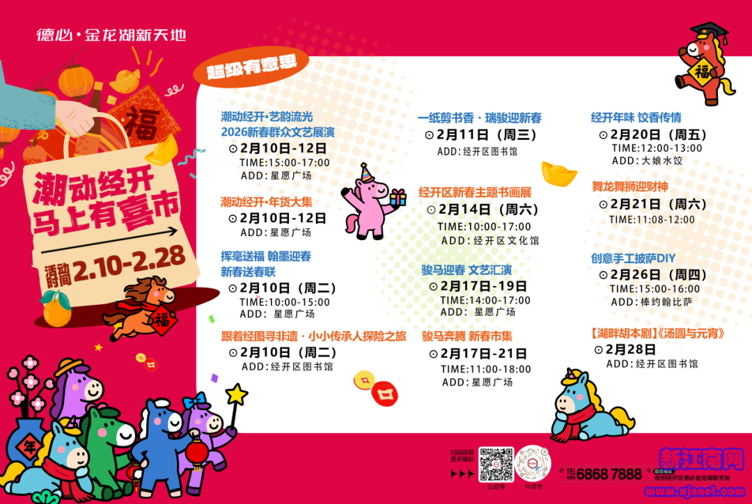 金龙湖新天地作为经开区年味核心区,从2月10日至28日推出系列新春活动,新春群众文艺展演、骏马迎春文艺汇演轮番登台,挥毫送福、年货大集、舞龙舞狮迎财神等民俗活动接连上演,还有饺子宴、手工披萨DIY等趣味体验,让市民在热闹的市集与展演中感受地道新春氛围。