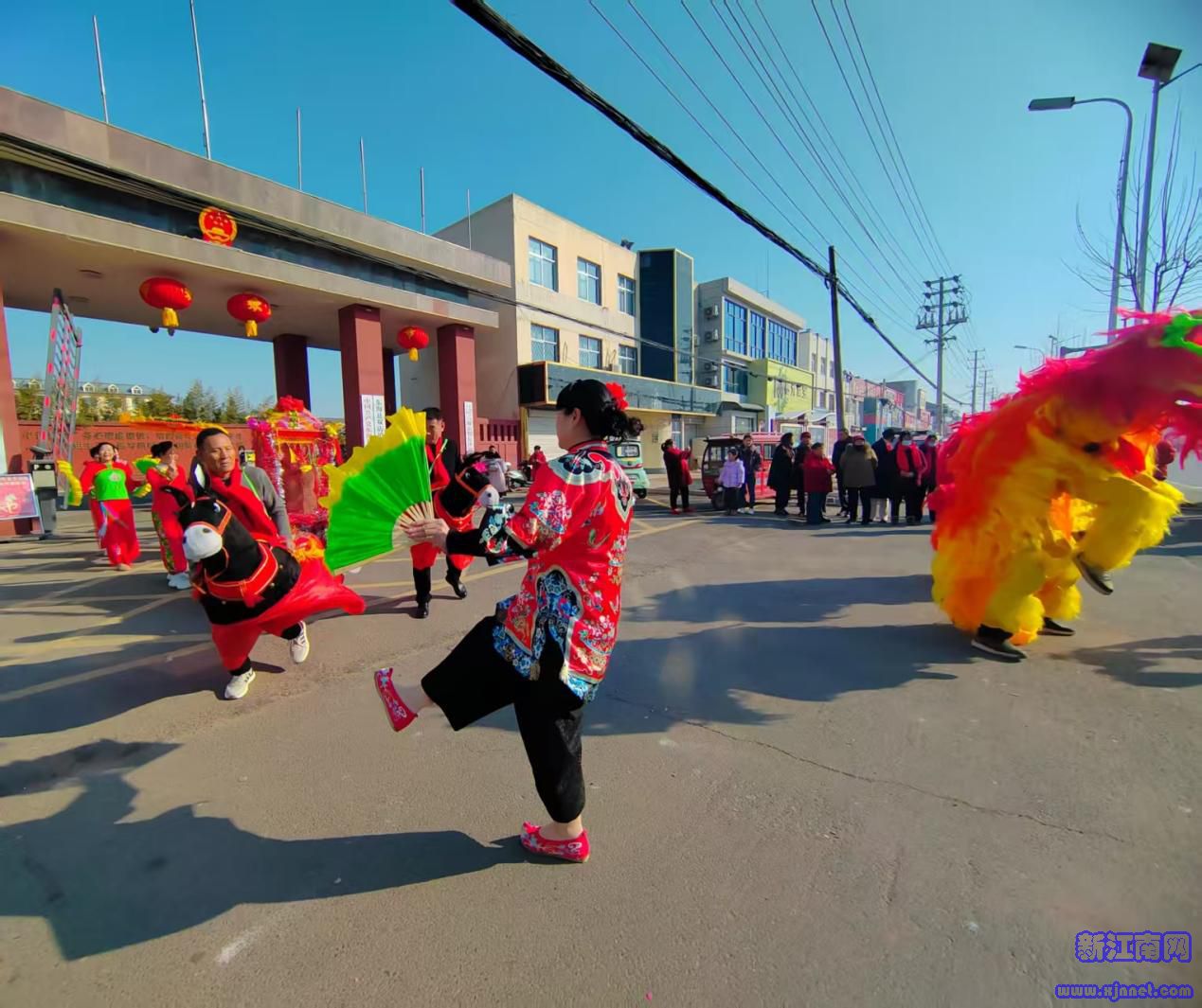 中国江苏网2月18日连云港讯 龙腾虎跃迎新春 莺歌燕舞贺大年。2月17日大年初一,东海双店镇十里商贸长街张灯结彩,欢声阵阵,热闹非凡,由双店镇新时代文明实践所、双店镇文化广电体育服务中心举办的茉莉花开文艺直通车“我们节日·春节民俗踩街过大年”文化巡游活动激情上演。“非遗”文化来袭,满街欢欣鼓舞。