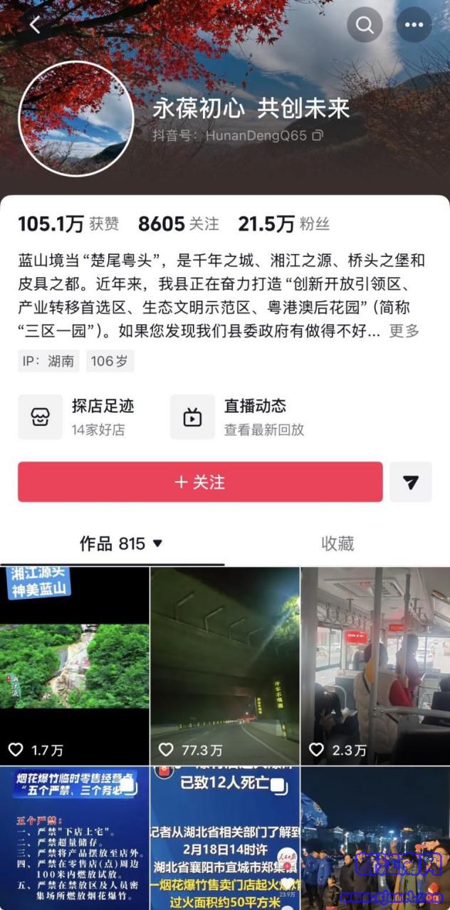 该账号目前发布的内容涵盖民生诉求办理、美景美食推介、政策传递和天气提醒等。账号的简介上还写道,“如果您发现我们政府系统做得不好的工作,请您及时拨打县政府值班电话0746-2213489或县委办值班室电话0746-2213231。我们彼此打开一扇信任之窗,建立互动工作机制,通过问题的解决来不断提升蓝山美誉度的同时,扩大蓝山的知名度。”让这个普通的新媒体账号充满了人情的温度。截至2月27日下午七点半,“永葆初心 共创未来”账号粉丝数已经突破21.5万。