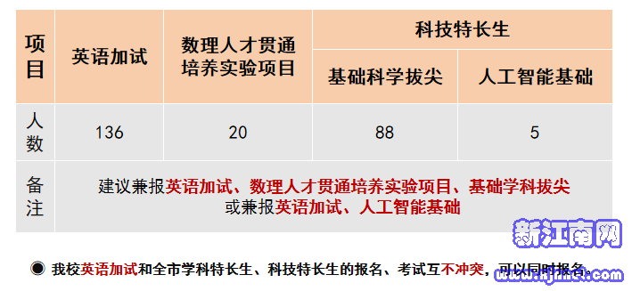 面向全市应届初三毕业生,通过“数理人才贯通培养实验项目”方式录取40人,其中面向南外初三毕业生招收20人,面向非南外初三毕业生招收20人。