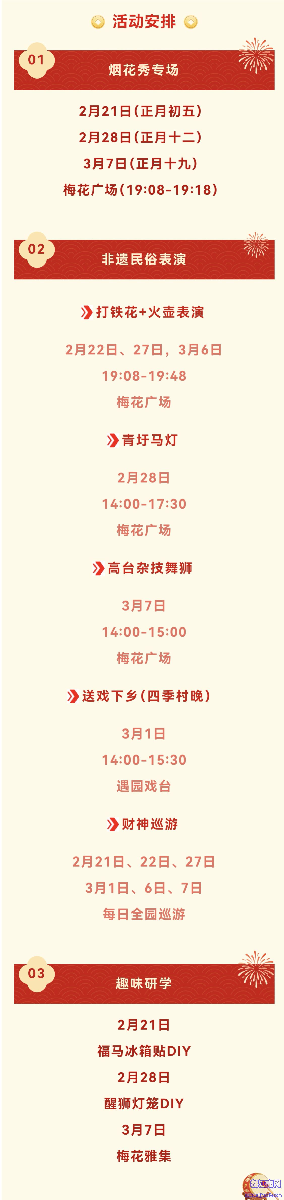 财神巡游全园送福,不倒翁小姐姐温柔互动,还有捏面人、糖画等非遗技艺展演;亲子研学DIY、梅花雅集、青圩马灯、高台杂技舞狮等活动,大人小孩都能找到乐趣~