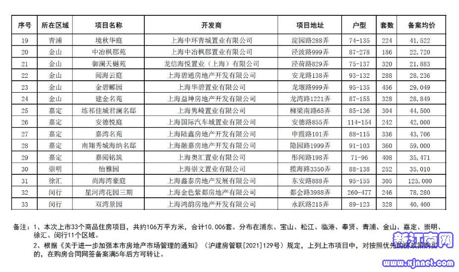 该批房源共33个项目,总面积达106万平方米,共计10,044套,分布在浦东、宝山、松江、临港、奉贤、青浦、金山、嘉定、崇明、徐汇、闵行等11个区域。这批房源中大部分为刚需盘,单套面积100平方米以下的占比约75%,除3个楼盘外,其他楼盘的备案均价为6万以下。该批房源中,续盘项目24个,备案均价均未上涨;新开楼盘价格也基本与周边在售同质楼盘持平。