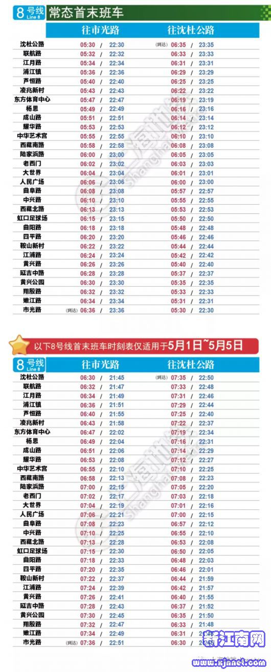5月1日至5日,8号线开展接触网和受电弓整治,首末班车时间调整