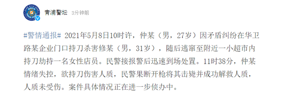 东方网记者李欢5月8日报道:2021年5月8日10时许,仲某(男,27岁)因矛盾纠纷在华卫路某企业门口持刀杀害修某(男,31岁),随后逃窜至附近一小超市内持刀劫持一名女性店员。民警接报警后迅速到场处置。11时38分,仲某情绪失控,欲持刀伤害人质,民警果断开枪将其击毙并成功解救人质,人质未受伤。案件具体情况正在进一步侦办中。