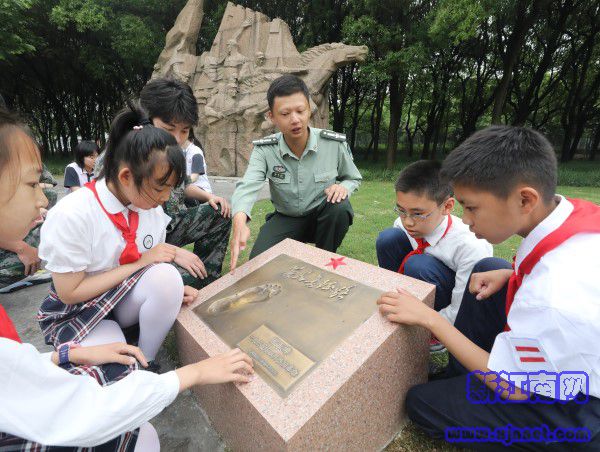 图说:东方绿舟的教官向学生们讲述红军长征的故事,并介绍足印园的由来。张龙 摄(下同)
