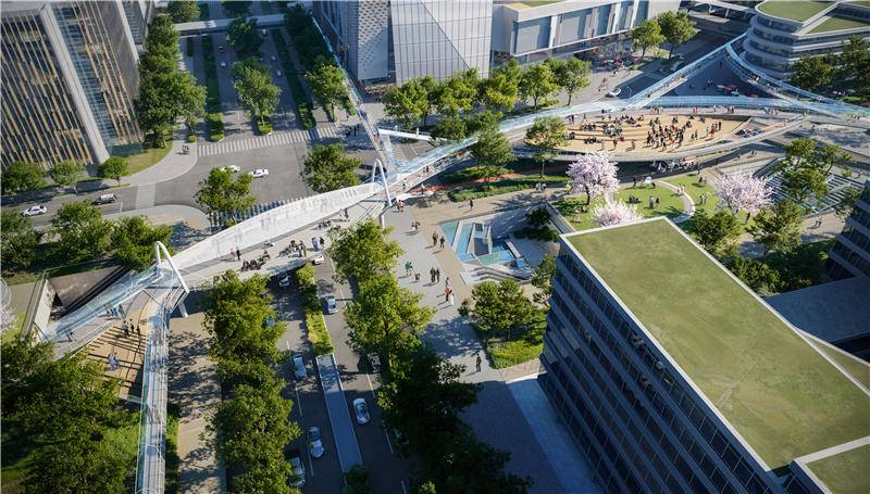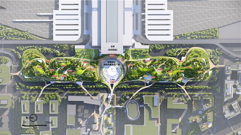 已建成的西交通平台将进行优化改造,植入虹桥全球服务中心、新质生产力展示馆、AI产业科创社区、虹桥活力商街等功能,营造“虹场绿丘”枢纽门户街区。并依托现状中轴线绿化景观,打造“高线飞虹”的公共空间序列,构建空中连廊、地面、地下三层立体慢行交通系统,高效便捷地连接东侧交通枢纽和西侧国家会展中心两大功能主体以及两侧商务办公建筑群。
