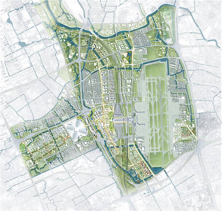 虹桥商务区在地区整体格局的基础上,突出三方面空间整合提升策略。一是着力增强功能核心:以虹桥枢纽中心、国家会展中心、苏州河滨水绿心构成虹桥商务区核心功能区,联动机场东片区,进一步提升核心竞争力。二是集中塑造生态绿脉:以吴淞江-苏州河、小涞港-北横泾两条绿廊为骨架,构筑“T型”生态空间,打造功能复合的高品质公共环境,提升地区整体标识度。三是有力推动功能贯通:结合特色风貌道路构建“活力环”,依托外环绿带、沪青平绿道、近郊绿环等构建“生态环”,串联虹桥商务区西北、西南、东北、东南四个象限的城市功能板块,提升虹桥商务区空间整体性和联通度。