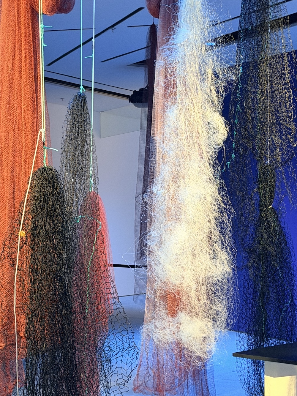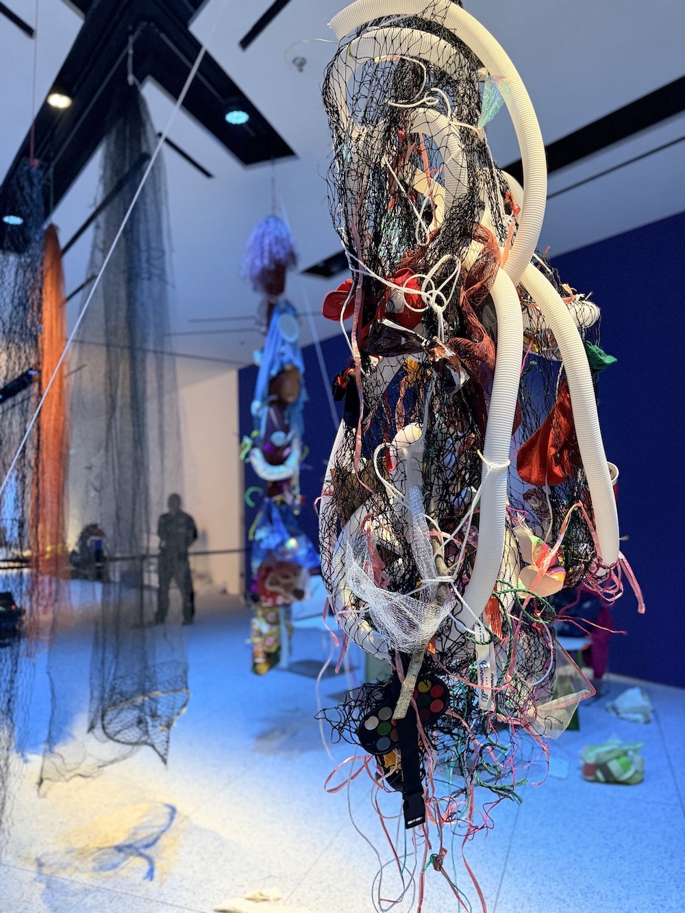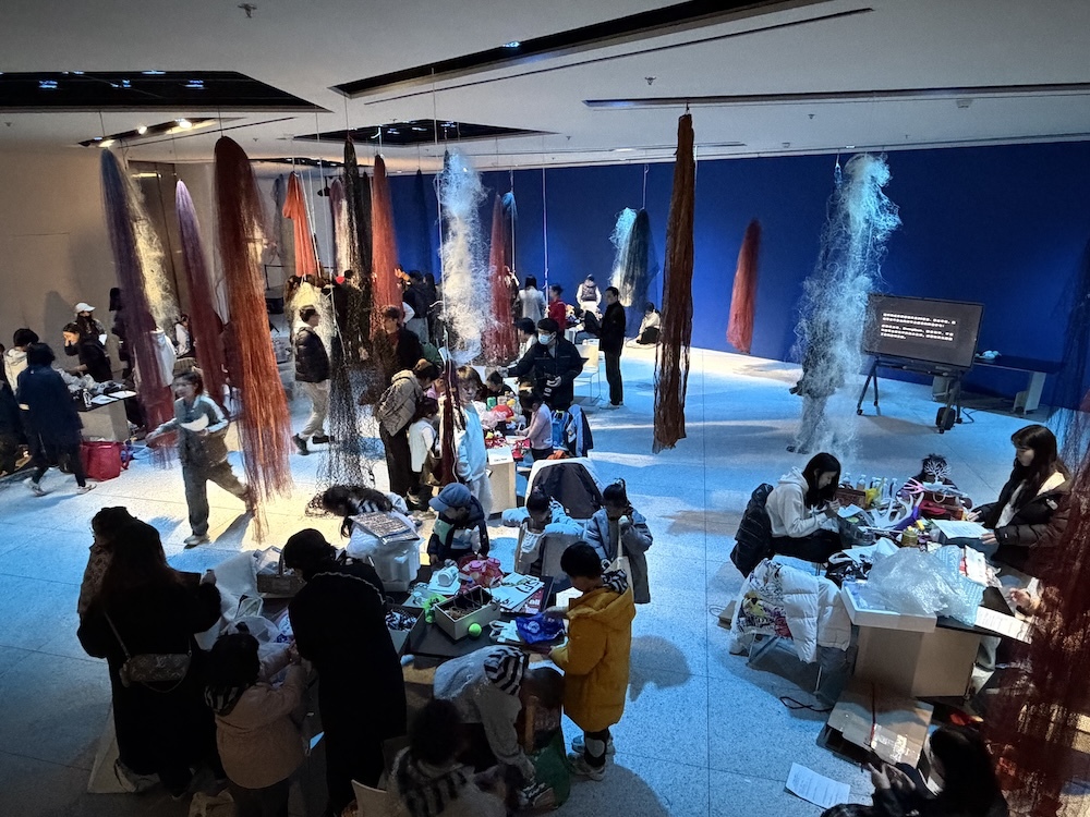 孩子们通过剪裁、缠绕、打结、连接,将渔网与拾得材料固定组合,逐步生成不同体量的雕塑形态。“打结像一种魔法动作,把破坏环境的遗留物转化为守护的象征。”凯塞多说。艺术家与学生围绕材料来源、海洋现状及个人行动展开持续交流,使B1展厅在当日成为一个“正在发生”的艺术现场,并最终诞生了一件由对话、协作与关怀共同塑造的艺术作品。