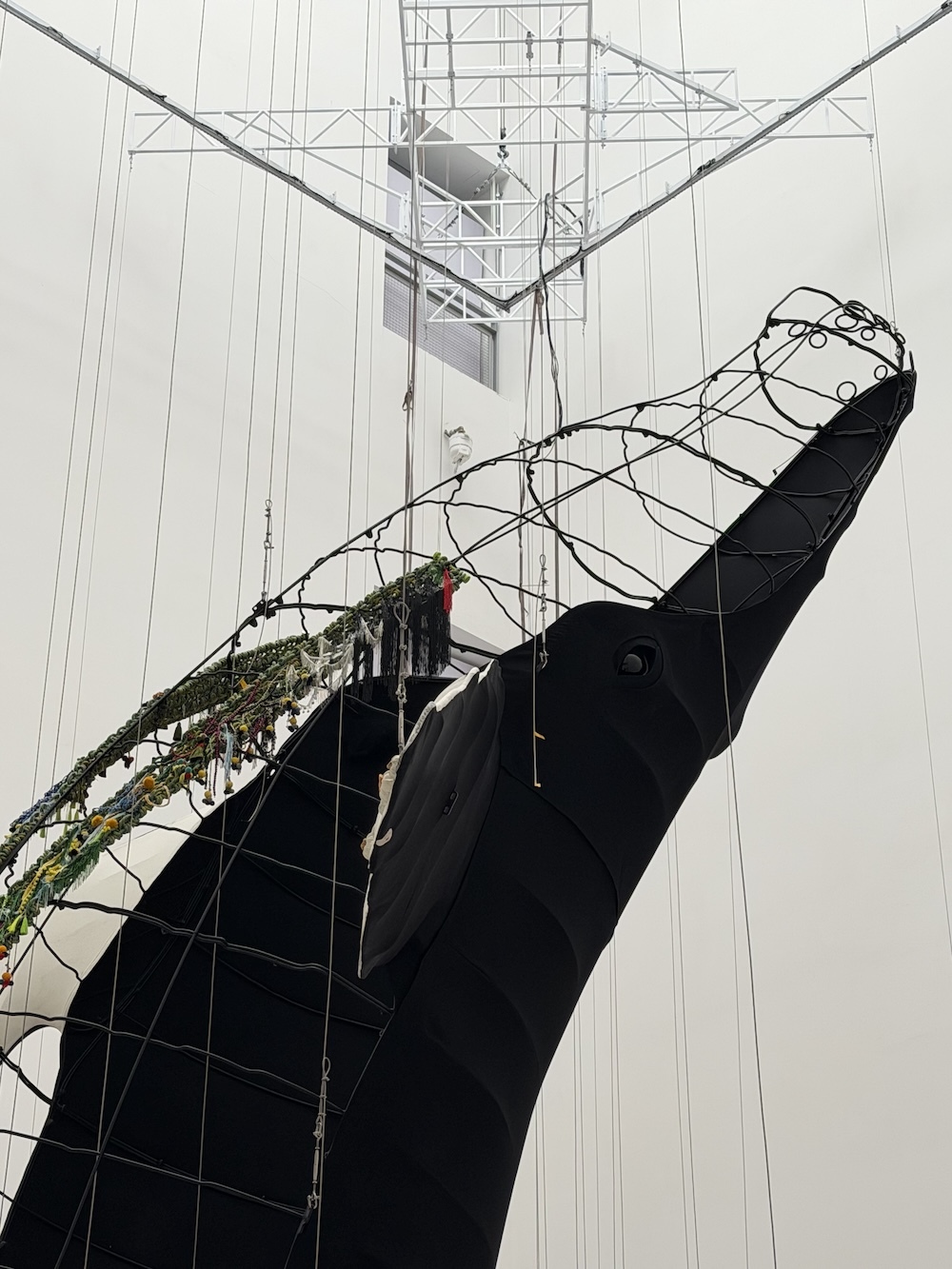 她尤其强调“凝视关系”的反转:鲸的眼睛以黑曜石制作,“会把人类的目光反射回去”。“观众走进来是为了看鲸,但鲸也在看着你。”在这件作品里,人类不再是唯一的叙事主体。