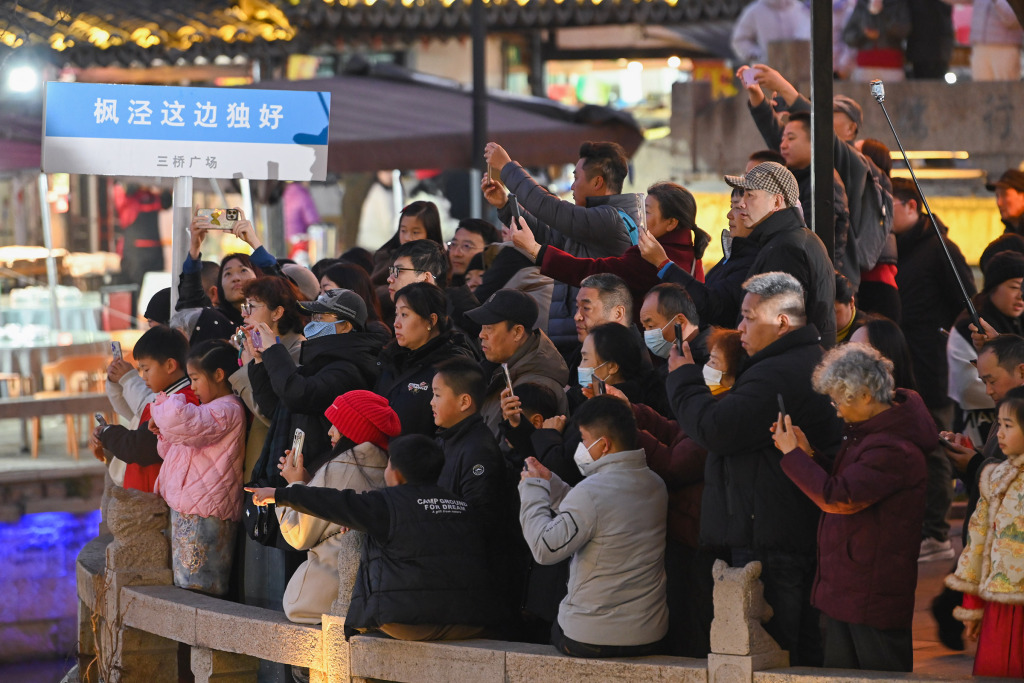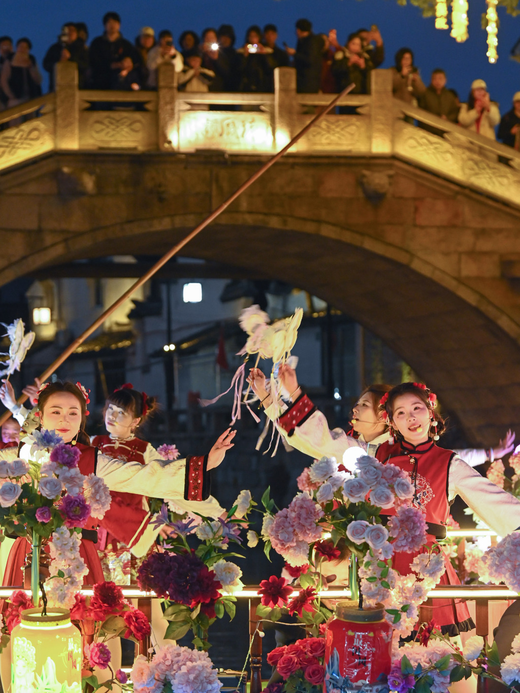 2026年2月18日,上海枫泾古镇,傍晚华灯初上,船上的舞蹈引得桥上观众的注意。