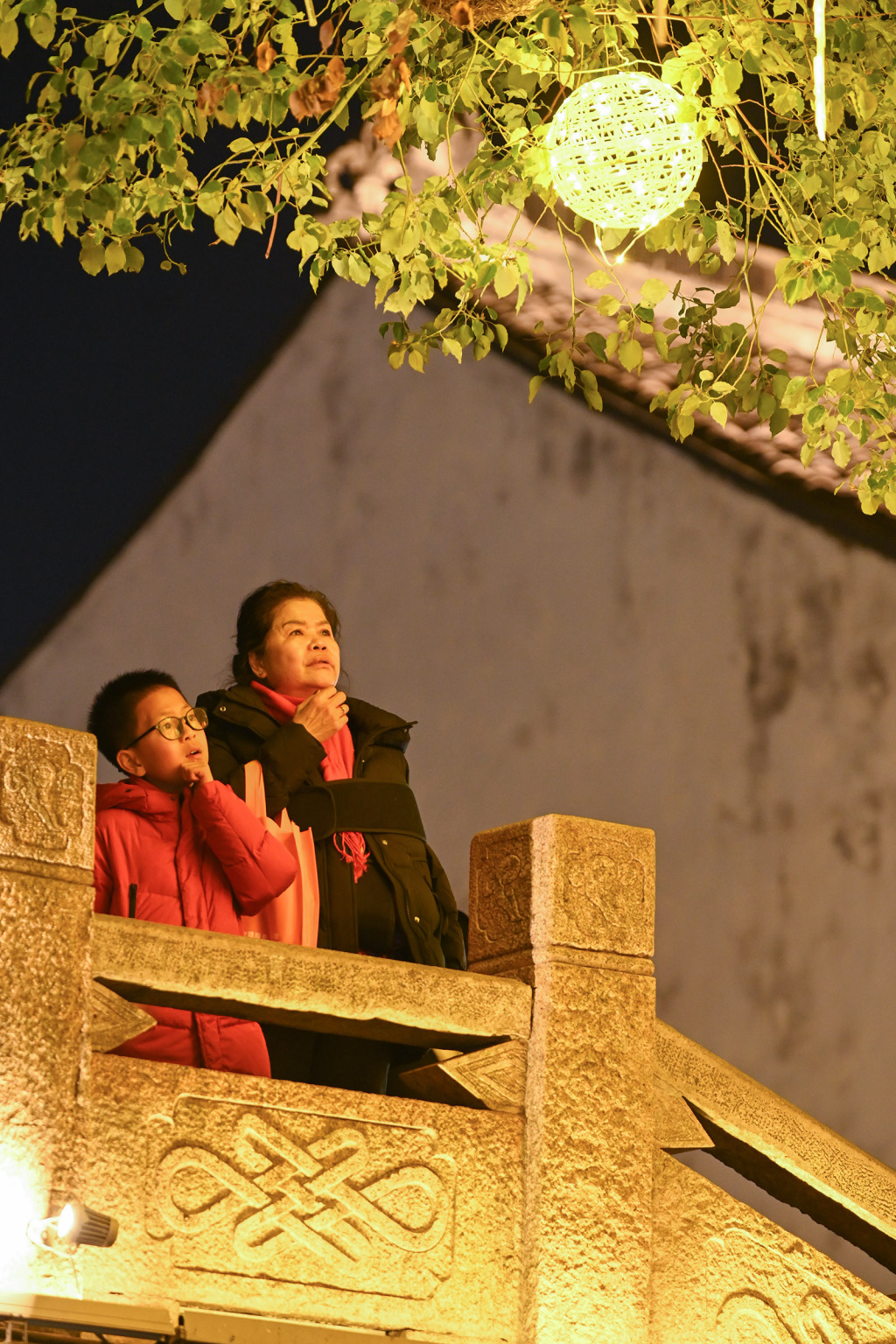 2026年2月18日,上海枫泾古镇桥上,游客在赏灯读诗。