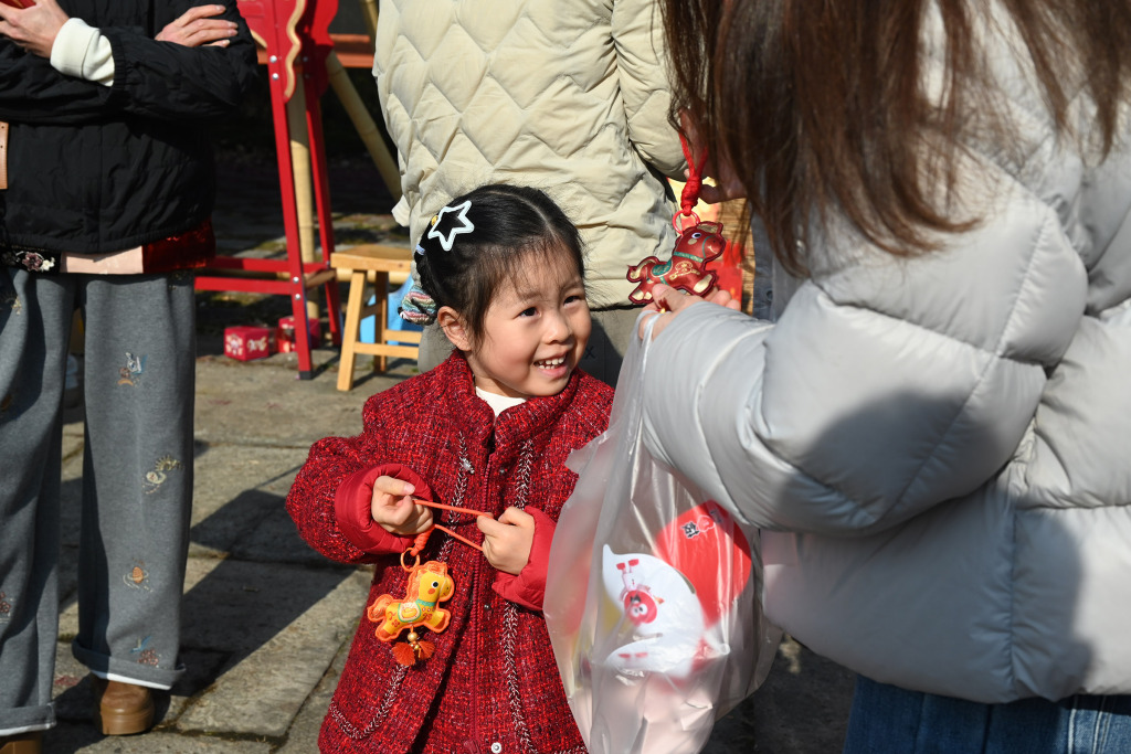 2026年2月18日,上海枫泾古镇,一个小女孩拆开了游戏赢来的小马玩具。