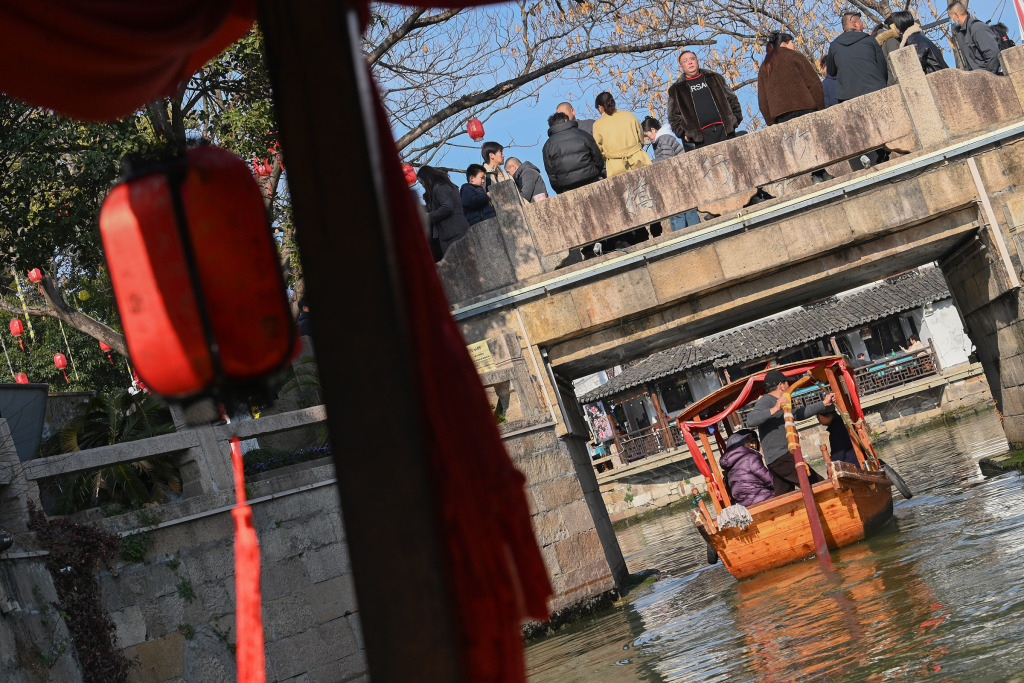 游枫泾,许多人选择从水路进到古镇中心,船和两岸装点着喜庆的红灯笼。65岁的沈丰益是一名划船工,据他介绍,年初一到初七,古镇每日有13艘船运营,从上午8点半到下午5点接送游客,平均每人每天划12次。“这几天人流量比较多,我们非常喜欢划船这个工作,为游客们服务。加上春节期间工资也更多,我们从小在水乡边长大,退休后能来划划船也很快乐。”沈丰益说。