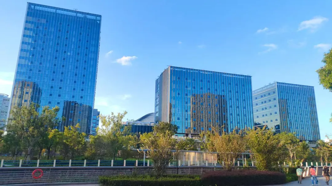 阳光倾洒,玻璃幕墙熠熠生辉,倒映出普陀区高质量发展的蓬勃脉动。