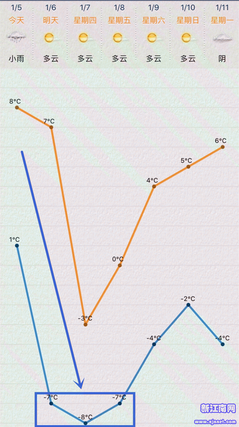 预计48小时最低气温降温幅度可达9~11℃,7日至9日将出现低于零下6℃的持续严重冰冻天气,过程极端最低气温-7~-8℃,出现在8日(周五)早晨。10日至11日最低气温为-2~-4℃,有冰冻。