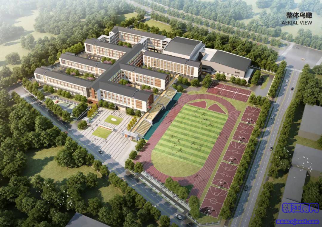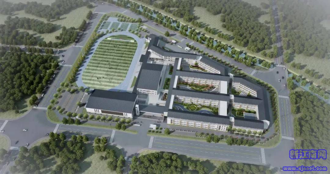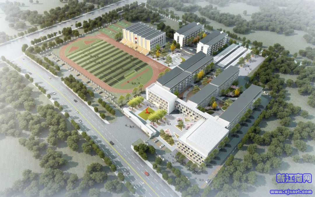金庭镇九年一贯制学校项目位于金庭镇新镇区金庭路东侧、后堡港路北侧,用地面积约99.5亩,总建筑面积68769.82平方米,包括小学教学楼、中学教学楼、行政楼、综合楼、食堂、艺体楼、地上活动平台、地下车库和各类室外运动场地。学校办学规模为8轨72班,其中小学8轨48班,中学8轨24班。项目总投资43000万元,已于2021年1月12日开工。