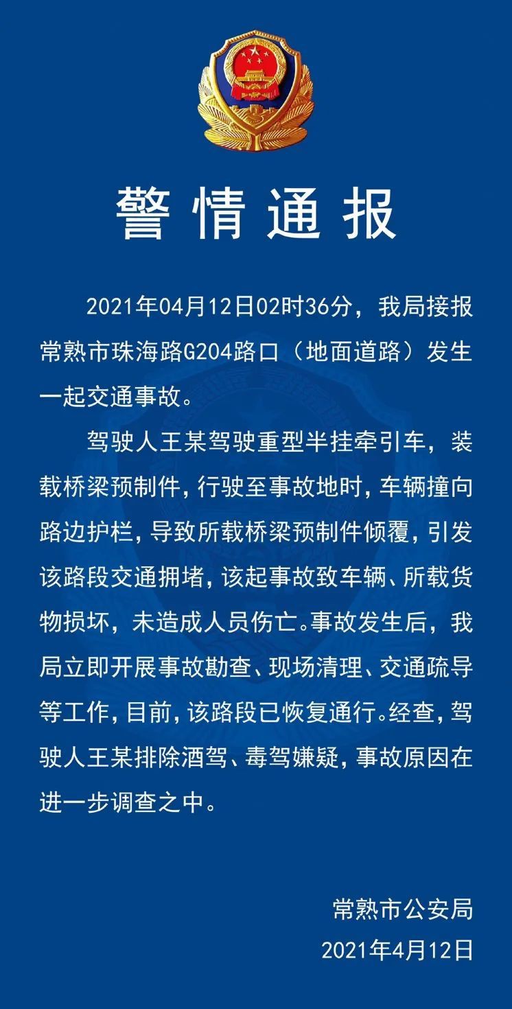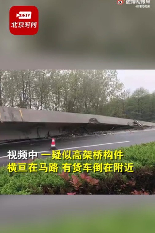 4月12日,网曝苏州常熟G204与珠海路交叉口,一高架桥发生位移,视频中一疑似高架桥构件横亘在马路,有货车倒在附近。