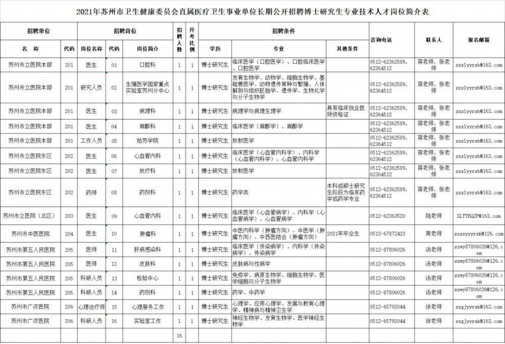 苏州市卫生健康委员会直属医疗卫生事业单位面向社会公开招聘博士研究生专业技术人才16名(事业编制),现将有关事项公告如下: