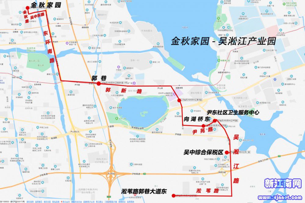 线路走向:金秋家园、吴中东路、东环南路、郭新路、清禾路、尹帆路、泾湾路、尹南路、吴淞江路、纬二路、吴淞江路、淞苇路、淞苇路郭巷大道东