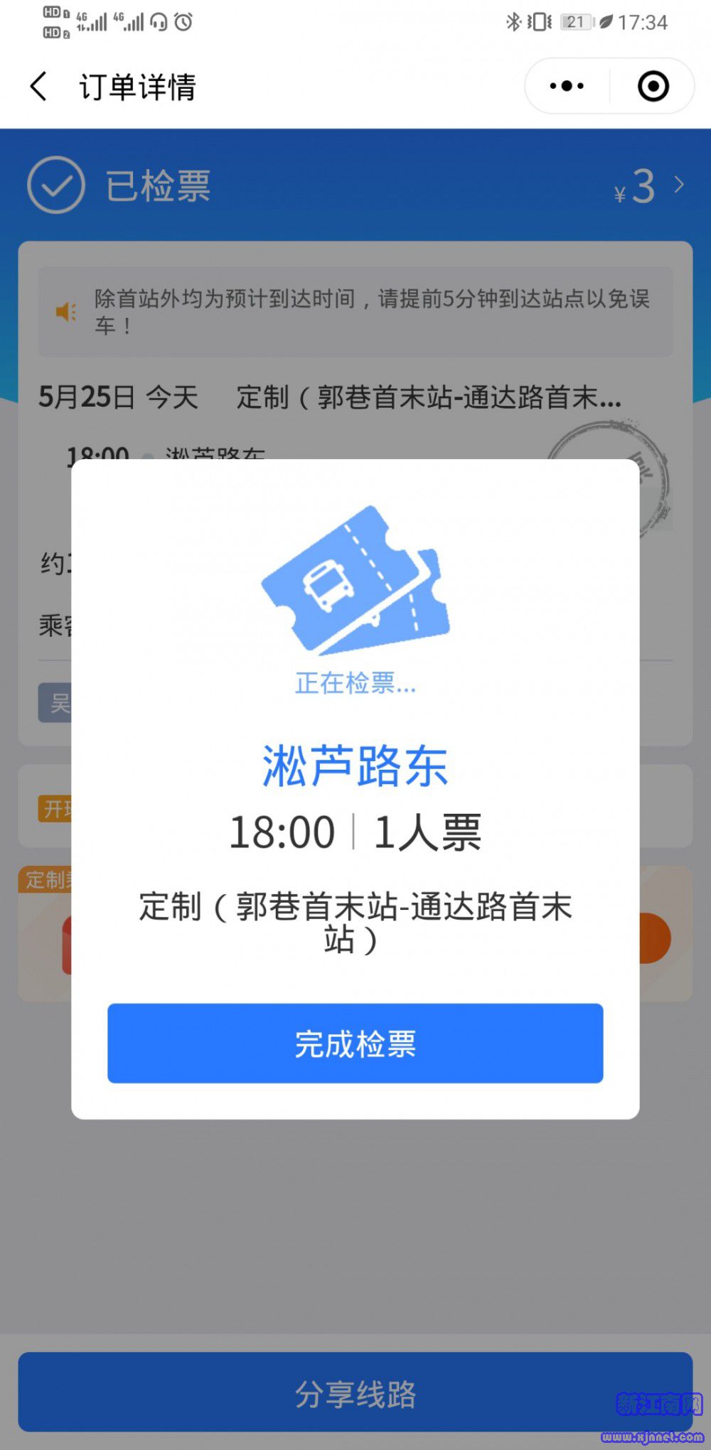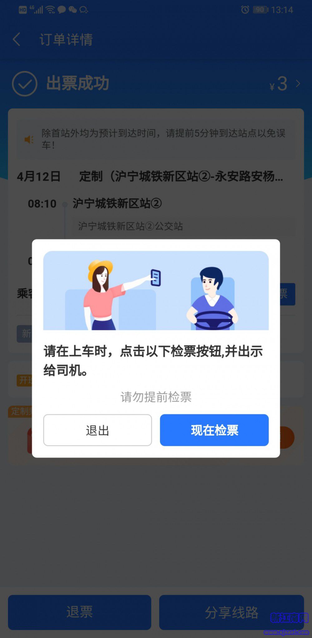 请于选择的上车时间点提前到达站点候车,上车前提前准备好手机进入购票订单,点击并向司机出示出示检票界面,并完成检票。