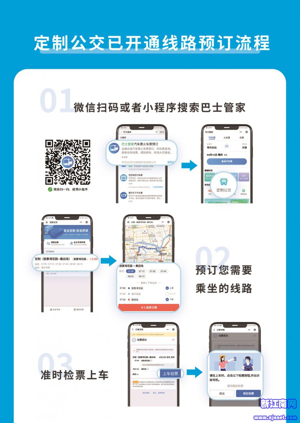 扫描二维码,或在微信中搜索公众号【巴士管家】,或下载巴士管家APP,找到【定制公交】模块并点击进入,找到相应的上下班线路,点击上下班时间及相应上车站点,选择日期,进入支付界面,选择企业支付,并完成领票流程(可预订多日票)。