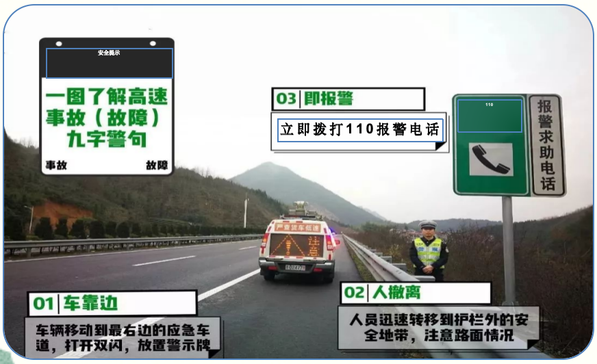 高速公路行车,要时刻保持安全车距,遇拥堵、缓行路段,不要随意穿插,切勿占用应急车道,发生交通事故或故障,要“车靠边、人撤离、即报警”。临近驶出高速公路出口要注意观察标志标牌,提前靠右侧行驶,切勿在出口处急刹、急停、突然变道、冒险倒车。
