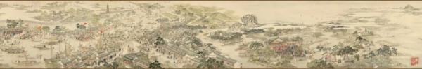清代画家徐扬绘就的《姑苏繁华图》自苏州西南灵岩山起,经木渎镇、横山、石湖、苏州郡城,出阊门、沿山塘街,终至虎丘山,完整呈现了“一村一镇一城一街” 的百里水乡景观,现藏于辽宁省博物馆。