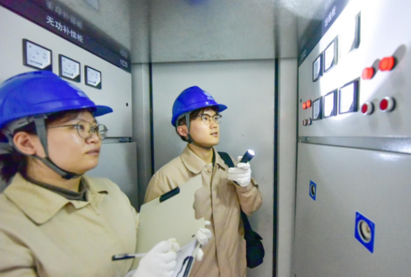 3月17日,国网昆山市供电公司市场营销部客户经理龚嫣然(左)、汤骏(右)在昆山云享城比亚迪闪充站预制舱专变配电室,开展设备巡检,全力保障闪充站供电稳定可靠。(翟剑鸣/摄)